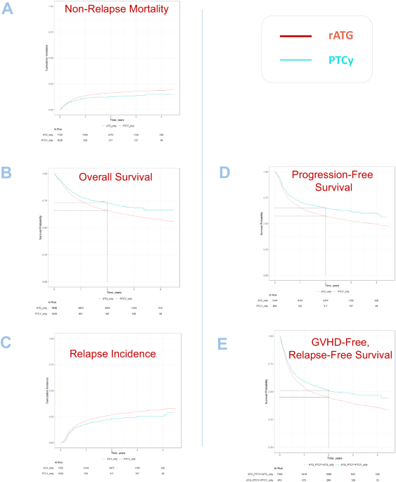 Patients in the rATG group were older, with a median age of 58.6 years (IQR (48.1, 65.4)), whereas patients in the PTCy group were 53 years (IQR 38.6, 62.3) (p< 0.01), and a similar proportion of men (57.3% for rATG and 58.9% for PTCy) p= 0.33), significantly reduced the use of TBI (14.5% vs. 24.7%; p< 0.01) and lower MAC utilization (52% vs. 62.3%, p< 0.01). The PTCy group also had a lower disease recurrence index and a more recent year of transplantation (Table 1). The remaining parameters were balanced between the two groups. Median follow-up was 2.1 years in both arms. More detailed information is shown in Table 1.